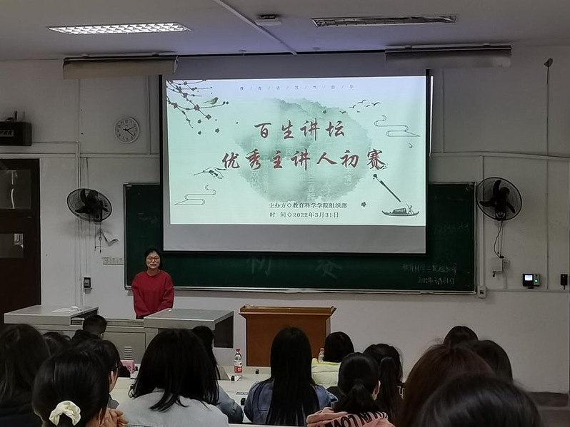 为深入学习习近平新时代中国特色社会主义思想,书写新时代青年爱党、爱国的新篇章,教育科学学院组织部于3月31日下午在教育大楼1j12教室举行了“百生讲坛”优秀主讲人初赛。本次比赛的嘉宾有校组织部副部长黄凯龙,教育科学学院学生团总支副书记张子玥和组织部部长徐沁燚,本次活动的主持人为组织部干事褚佳慧。