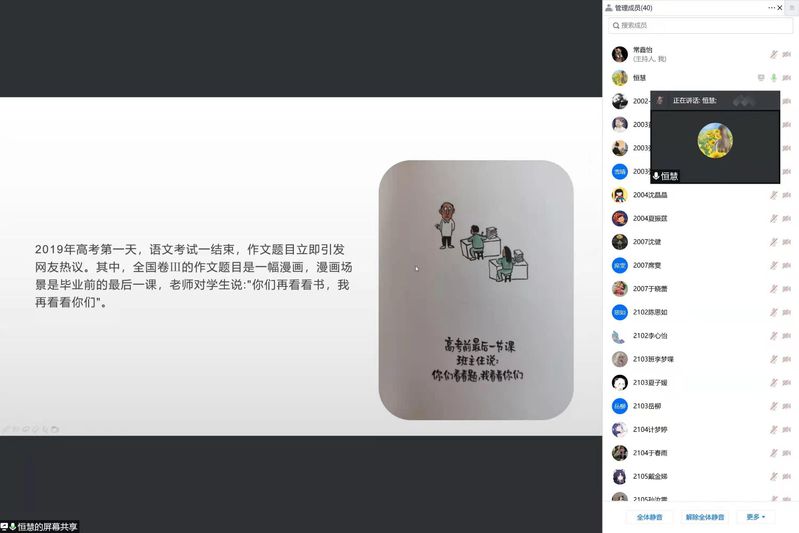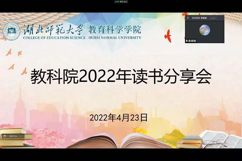 4月23日是“世界读书日”,为了提高同学们对于读书的认识,营造优良的学习氛围,教育科学学院于4月23日下午在腾讯会议举办“读书分享会”。辅导员秦姗姗与2021年度“阅读之星”的向恒慧、彭艳两位同学参加了本次会议。本次会议由辅导员秦姗姗主持。