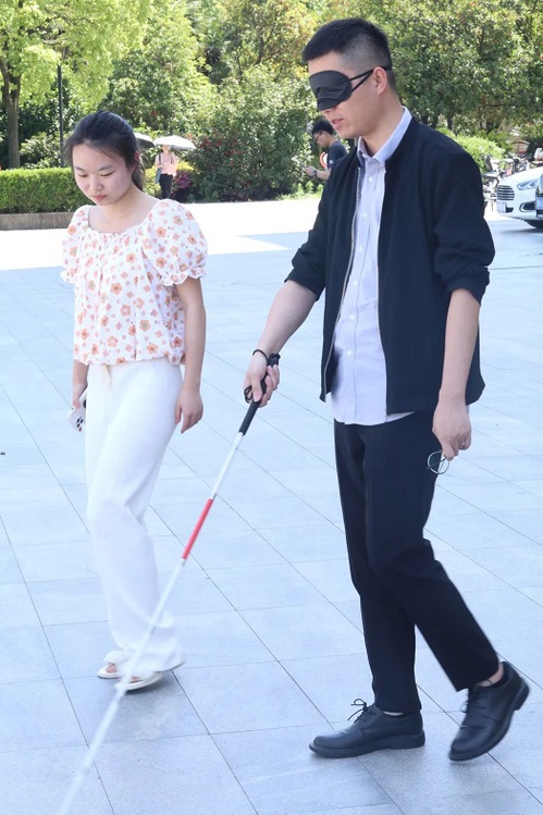 首先,同学们邀请了一些体验者,体验者会戴上眼罩并使用盲杖,在引导者的帮助下,绕着篮球场走一圈,体验了视障人士的世界。活动期间,同学们利用所学的知识来对体验者进行合理的引导。同学们在体验活动结束之后,对体验者进行采访,询问他们的感受及想法。体验者们都表达了体验活动进行过程中的害怕与艰难以及在此次过程中切身实地地体会到了视障人士的不易。最后,张琦老师谈到了视障人士无法像我们一样用视觉去观察世界,只能用触觉去感受,同学们应该给他们更多的关爱与理解。