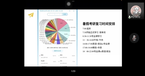 活动伊始,秦姗姗老师向同学们介绍了会议目的,四位考研成功的同学先后进行了经验分享。首先是已考取浙江师范大学教育学学术性研究生的陈晨,陈晨同学从政治、英语、教育学专业基础综合三个方面展开了自己的经验分享;随后是考取西南大学基础心理学研究生的丁汝,丁汝同学着重介绍了公共课与专业课复习的网课、资料与时间的合理安排;接着是考取华南师范大学小学教育专业研究生的曹芹芹,曹芹芹同学从专业简介、考研初心、考研历程、上岸心得四个方面分享了自己的宝贵经验,详细地介绍了学习英语的方法,并给出了实用的小建议;最后是考取中南民族大学心理健康教育专业研究生的蔡文静,蔡文静同学用结构图的形式直观地展现了择校、网课选择、时间管理三方面的内容,让参会的同学们清楚明晰地了解到相关方面的知识。经验分享结束后,参加线上会议的同学们对于考研提出了自己的疑惑,如怎样平衡实习与考研等等,四位同学针对不同的问题做出了相应的解答。最后,秦姗姗老师总结道,考研的同学应当未雨绸缪,利用好碎片化时间做好复习工作,同时祝愿同学们都能成功上岸。至此,本次会议圆满结束。