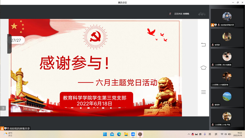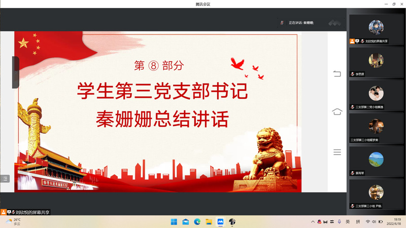 6月18日晚上,我院学生第三党支部在腾讯会议开展了以“党员干部下基层,师生群众得实惠”为主题的六月主题党日活动。我院学生第三党支部全体党员参加了本次活动,活动由我院第三党支部书记秦姗姗主持。