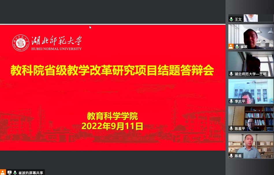 9月11日上午,教育科学学院在腾讯会议室举行了省级教学改革研究项目结题答辩会议。华中科技大学教育科学研究院副院长李太平教授、浙江师范大学陈星教授、浙江财经大学陈星平教授、湖北royal皇家88平台王文教授和王明副教授,校教学督导杜汉生教授参与会议。会议由教育科学学院副院长崔波主持。