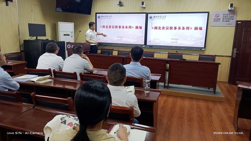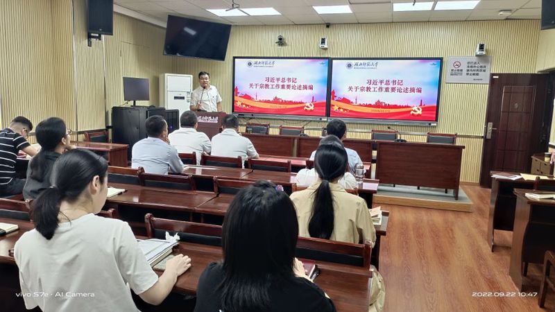 会议开始,全体党员按期缴纳了党费,重温入党誓词,学习了《党章》。随后,刘艳春分别领学了习近平在湖北、新疆、辽宁考察的重要讲话精神以及在省部级主要领导干部“学习习近平总书记重要讲话精神,迎接党的二十大”专题研讨班上的重要讲话精神,并学习了习近平在庆祝香港回归祖国25周年大会暨香港特别行政区第六届政府就职典礼上的讲话和给“中国好人”李培生胡晓春的回信精神。学院党总支书记徐明波领学了《高等学校新冠肺炎疫情防控技术方案(第六版))》《习近平总书记关于宗教工作重要论述(摘编)》《湖北省宗教事务条例(摘编)》《中央和省委民族工作会议精神》《全国和全省宗教工作会议精神》《共产党员不得信仰宗教等法律法规》等摘编。