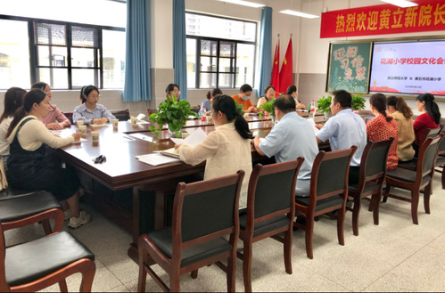 9月23日上午,教育科学学院小学教育系邓李梅、黄娅、柴霞、朱培芳老师,带领小学教育硕士生前往黄石市花湖小学参加学校文化研讨活动实习培训工作。花湖小学党支部书记肖青花校长唐金华、教学副校长伍元梅、德育副校长余小琴、后勤副校长樊志刚、行政办公室主任黄燕参与了此次研讨活动。