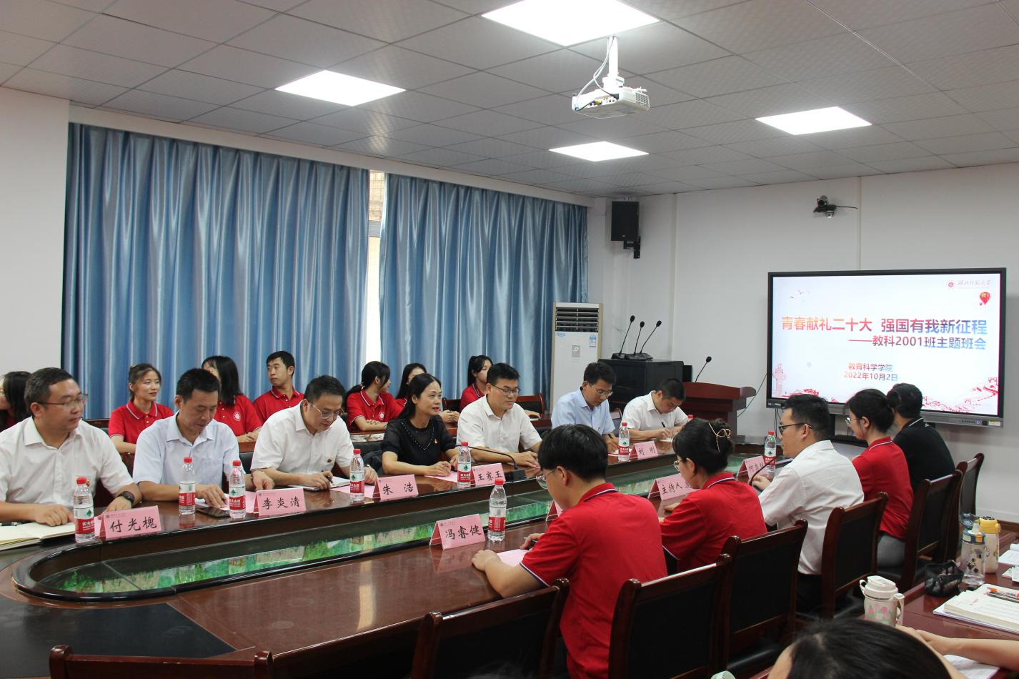 为迎接党的二十大胜利召开,同时结合党员干部下基层察民情解民忧暖民心主题实践活动,教育科学学院2001班于10月2日晚利用周日晚点名,在教育大楼1317A会议室召开“青春献礼二十大,强国有我新征程”主题班会。校党委常委、副校长王赛玉、学院领导班子、辅导员、2001班全体同学参加会议。会议由2001班班主任鹿星南博士主持。