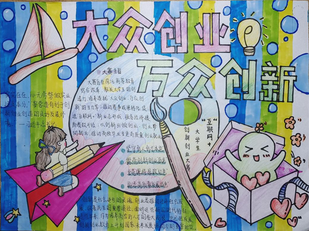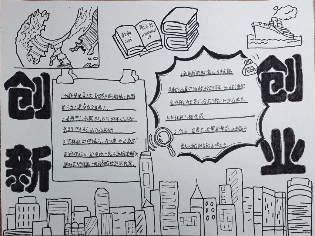 首先,参赛选手们用绘画工具绘出风格各异的手抄报作品,创新创业部统一收集各班同学的稿件并进行第一轮筛选。随后,通过线上投票和评委筛选的方式评选出本次活动获奖人员,其中2102班潘蕾锾同学、2103班熊姿同学的作品风格明快、中心明确,整体美观大方,文字优美充实,荣获一等奖。