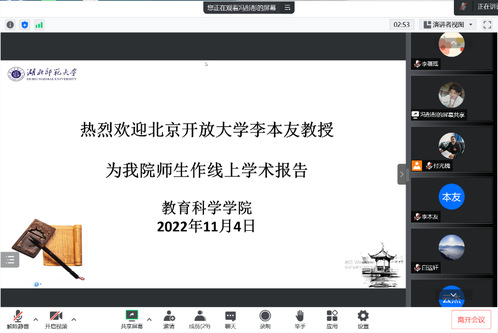 为进一步加强教师队伍建设,为广大教师搭建更广阔的学术交流平台,营造宽松活跃的学术交流氛围,了解学术动态,加强学界交流。同时,以促进高层次科研项目的申报和高水平学术论文的发表为目标,培育标志性学术成果,在高层次项目申报和高水平论文发表方面取得新的突破。教育科学学院于2022年10月至11月开展“磁湖学术活动日· 教育科学学院科研能力提升系列活动”。我院教师及全体研究生参加了此次活动,活动由副院长付光槐主持。