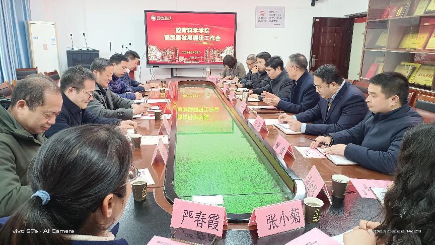 3月22日下午,校长雷儒金一行到教育科学学院参加高质量发展调研会。教务处、人事处、科研处、后勤管理中心等单位相关负责人,教育科学学院班子成员和教师代表参加调研座谈会。会议由学院党委书记杨志丹主持。