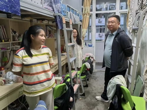 为更好的了解学生中秋、国庆双节假后返校情况,关注学生假期生活与安全,教育科学学院于10月6日晚七点对本院学生宿舍进行了走访慰问参与本次查寝工作的有教育科学学院党委副书记刘广兵,辅导员秦姗姗,以及部分班主任老师学生干部。