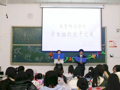 为了增强组织的凝聚力,帮助各部门成员互相了解,增进彼此之间的感情。教育科学学院学生会秘书部学生自律委员会秘书部于11月30日晚7:00在科技大楼9103联合举办第二十四届团委学生会和第三届学生自律委员会院干之夜活动,参加本次活动的有党委副书记刘广兵、辅导员秦姗姗、刘丽娟,团委副书记刘新宇、段小芳,学生会主席宋米岍玥、翟彩云,学生自律委员会主席金依、岳柳以及三大组织全体部长和干事。