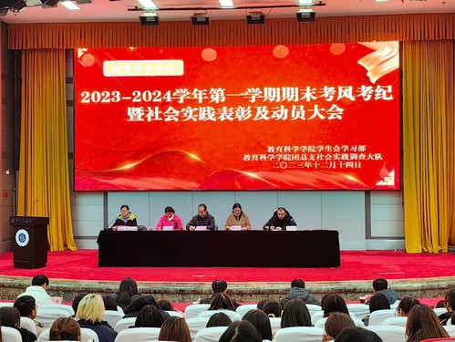为加强考风考纪建设,营造诚信应考的氛围,并鼓励学生积极参与寒期社会实践,教育科学学院于12月14日下午13:30在教育大楼报告厅举行了2023-2024学年第一学期期末考风考纪暨社会实践表彰及动员大会。出席本次会议的嘉宾有教育科学学院党委副书记刘广兵,副院长张小菊,辅导员秦姗姗、伊力扎提·阿布里米提及23级各班班主任和23级全体学生及学生代表,由辅导员刘丽娟主持本次会议。