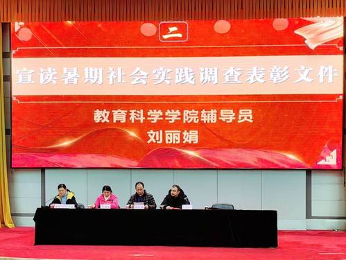 会议第二项,社会实践表彰及动员大会正式开始。首先,社会实践调查大队实践部部长王雨晨介绍寒暑期社会实践活动相关工作,为同学们讲解相关事宜,并呼吁更多的同学参与其中,完善自我,不断提升各方面能力素养。之后,辅导员刘丽娟宣读2023年暑期社会实践调查表彰文件,由学院领导为在暑期社会实践活动中表现卓越的学生颁奖。随后,暑期社会实践优秀学生代表吴希葶上台发言,她表示社会实践是一次珍贵的锻炼和实践的机会,也是增知识、长才干的大好平台,为同学们分享自己的经验及心得体会。接着进行大会第三个环节,2023年教育科学学院微课大赛表彰,由各班班主任为微课大赛获奖人员颁奖。