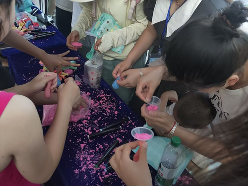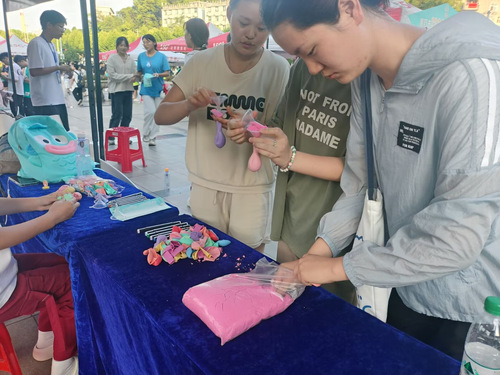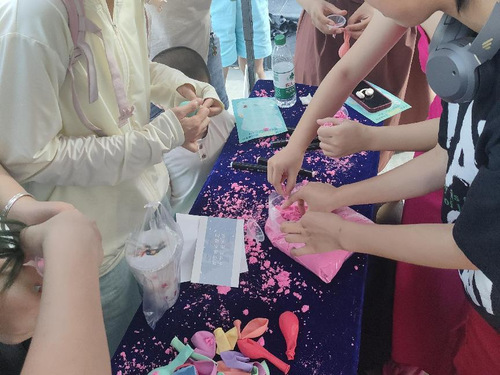 活动伊始,心理部成员进行策划部署,做好前期摆点的准备工作。参与者们需将太空沙成功倒进气球来完成减压球的制作。这不仅考验参与者们的耐心,也从心理层面反应了参与者们对困难的应对能力。活动过程中,工作人员详细介绍游戏规则并引导参与者们进行减压球的制作,参与者们相互交流游戏技巧和心得体会,同时在欢声笑语中期待着下一次活动的到来。最后,心理部成员整理游戏场地,为本次活动画上了圆满句号。