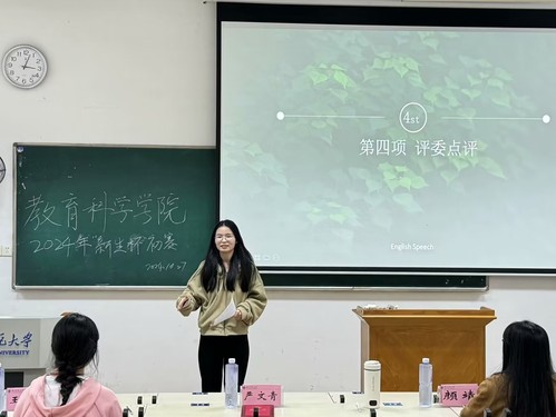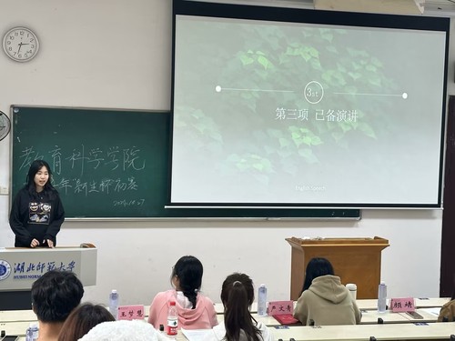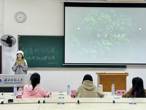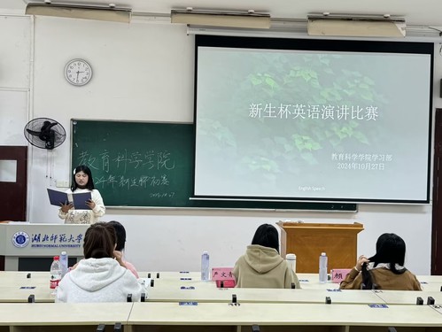 为营造良好的英语学习氛围,进一步提高教育科学学院学生英语口语表达能力,教育科学学院于1027日下午在教育大楼1J13举办了“新生杯”英语演讲比赛。湖北师范大学英语演讲队22级队长颜靖、2022年“新生杯”一等奖、2022届外国语演讲比赛一等奖和最佳语音奖获得者严文青、2022年“新生杯”演讲比赛二等奖获得者王梦慧作为本次比赛的评委莅临比赛现场。