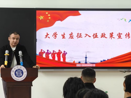 活动伊始,主持人简雅雯作开场白,介绍到场嘉宾,并讲述了活动目的,希望同学们从活动中汲取力量,歌颂爱国情怀。紧接着何勇上台讲述个人在部队的生活,分享军旅生涯的收获与成长,传播军旅文化,针对目前反间谍诈骗活动作出指引告诫。随后,伊力扎提宣讲征兵政策,为在场同学详细地介绍了参军入伍的流程,以及参军政策,鼓励同学们踊跃参军。秦姗姗进行总结发言,鼓励同学们积极参军入伍为国争光,磨砺人生。最后,所有人员共同拍照留念。