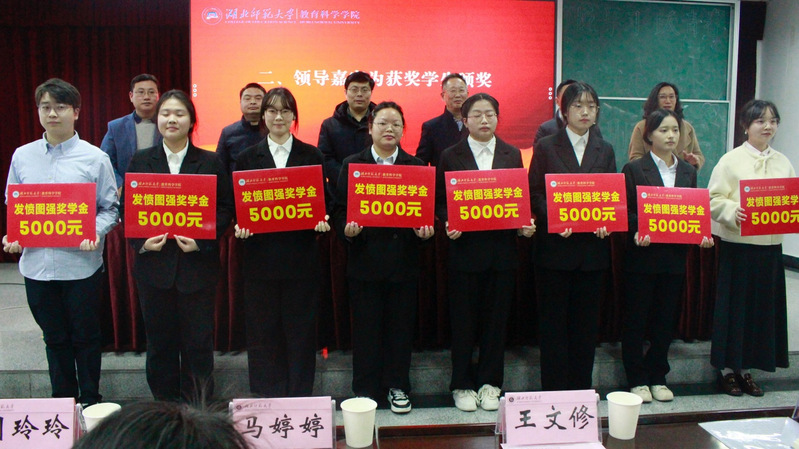 为表彰优秀学生,鼓励学生发愤图强、积极向上。12月12日下午,教育科学学院在信息大楼报告厅举办了“2024年发愤图强奖学金”颁奖仪式。教育科学学院涂艳国院长,校友工作处处长刘洋,学工部(处)副部(处)长熊英,教育科学学院党委书记杨志丹,副院长崔波,副院长张小菊,班主任代表,学工办全体成员出席仪式,获奖学生与24级部分新生参与仪式。仪式由教育科学学院党委副书记刘广兵主持。