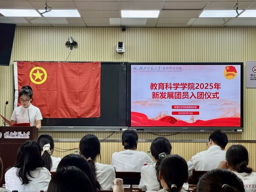 仪式在雄壮的《光荣啊,中国共青团》团歌声中正式开始。伴着鲜艳的共青团旗帜,全体与会人员肃立注目共同奏唱团歌。首先由许广昊宣读了教育科学学院2025年新发展团员名单,16名青年光荣加入中国共产主义青年团。学院团委书记刘丽娟为新团员颁发团员证并佩戴团徽。闪耀的证明与徽章承载着光荣的身份,更寄托着“党有号召、团有行动”使命的传承。紧接着,全体新发展团员在领誓人齐瑞佳带领下,面向团旗高举右拳庄严宣誓:“我志愿加入中国共产主义青年团,坚决拥护中国共产党的领导……”铿锵有力的誓言掷地有声,展现了教育科学学院青年矢志不渝跟党走的坚定信念。宣誓结束后,新发展团员代表刘姿姿发言,表达了对团组织的向往和为团旗增辉的决心,将在以后的学习生活中用实际行动践行团员的担当。最后,优秀团员代表雷伍娇向新发展团员表示热烈祝贺,并对他们提出殷切期望,希望大家牢记入团初心,以团员标准严格要求自己,努力学习、勇担使命,用实际行动践行“请党放心,强国有我”的青春誓言。