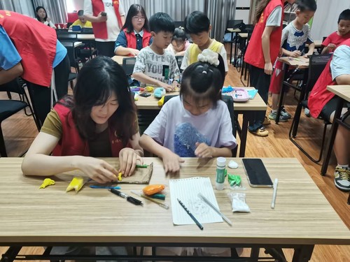 最后,冉诗晴让小朋友们用粘土在纸板上创作甲骨文,实践队队员在旁进行指导协助。孩子们积极展示自己的作品,活动还评选出优秀作品进行展示,进一步激发小朋友们对文字学习的兴趣。